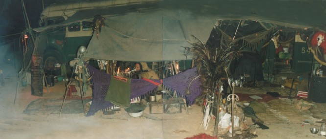 track.The spectacle was fun for a while -I had a good manic dance- but I found the noise abrasive in its continuity and lack of resonance with the land there. The latest Gabba breakbeats from the Paris underground would make a lot of sense in that Urban environment, but they didn't really cut it in the Australian desert. I'm sure the DJs would have realized that if they'd stopped long enough to feel and 'hear' the silent beauty of the land. We jammed some live music intermittently on our own little system for a few nights too, but didn't go into a full stage show as there wasn't the audience to warrant it. Thinking everyone must be up at the main floor, I'd wander up there to find only a handful there also. It seemed people were still just adjusting themselves to the environment and doing their own things. Apparently it was pretty scattered this early in the trip last year too -I see Earthdream 2001 slowly pulling together now a month or so later, as the different clans get to know each other better after adjusting to life in the desert and on the road.