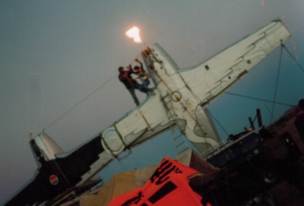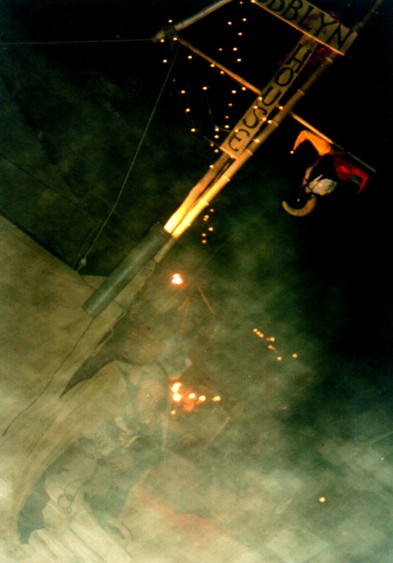 and roar of Robin's giant fire organ.![]() That night we hosted a cabaret night in the Gobblyn Camp. A slideshow of the peace walk from Lake Eyre to Sydney last year, and we (the HarleQuintet minus one) played a mixture of improvisational music and some of our more carnivalesque songs, including the first performance of my new 'HarleQuins Parade (Who's afraid of the Masquerade?)' piece, for-which Aros wore the Skork (skeletal elephantine mask with vertebraeic trunk) mask and blew its trumpet eyepiece on cue. With our Circus song Rusty ate and spun fire. It was a nice mellow night. Then it was time to start packing up -something Amordios has not as much relish for as his exuberant setting-up intricacies -slowly over several days. By the time we got out of there most people had already moved on to the old Keepers of Lake Eyre camp up the road. I'm glad we were still there to experience the water -in this dry desolate area Jacob discovered a big damp patch on a mound just at the edge of our makeshift settlement. It didn't go away, it was seeping up from the earth and will probably become a mound spring - a source of water for future Earthdream gatherings. After our second annual gathering there, it was a wondrous sign -that the Earth was somehow appreciative and supportive of our mission. Up the road at the camp opposite Lake Eyre there is a mound spring too, that's been there for a while. Undeterred by the Uranium Mines trashing the place with bulldozers (inc. elder Kevin Buzzacott's special camp after all their talk of respecting the aboriginal landrights), it didn't take us long to realize that rather than prevent us from camping there anymore as they had intended, their work has provided the churned earth necessary to start vegetable gardens from this abundant mound water, turning the area into a desert oasis. A handful of people have remained there to get this going. ![]() Above photo (c)01 Bonsai. All other photos except as noted and text (c)01 Orryelle. On to Orryelle's Illustrated EARTHDREAM '01 JOURNALS PART II -LAKE EYRE to COOBER PEDY |