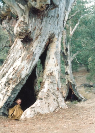 ![]() Two 'Ships of the Desert' - The 'Cedar Bel Seal' Gobblyn Bus and Kestral on the old-railway-sleeper camel sculpture sundial (neck casts shadows on brick mandala) After hearing how beautiful the area around Lake Eyre was supposed to be, on first arriving at Alberrie Creek I was initially disappointed. My first thought was, 'There's nothing here.' But the next day after walking the desolate landscape for 6 hours or so I began to appreciate its subtleties -beautiful rocks of greatly varied hue, pattern and size everywhere, winding sandy old creekbeds, and the most consistently beautiful sunsets and sunrises I have seen anywhere. The FEEL of the land is intense -almost as if the lack of physical landmarks are compensated by a more concentrated energy seeping up through the feet. Ah, and the night sky! Nowhere have I seen more clearly the starry body of our Lady Nuit arched in glittering splendour overhead than in the deserts of Central Australia, where the great bejewelled dome of the sky is unmarred by pollution or any light or protrusions from the land, reaching from flat horizon to flat horizon and beyond out into infinite space. Even on the dark moon onwhich we arrived, one could almost read by the brilliance of the spangled starlight of Nuit! ![]() Photo (c)01 Bonsai We (the HarleQuintet -depicted at left- and company) arrived in Amordios's rickety old Gobblyn Bus just before dusk of the night of new moon. A Horus-Maat Lodge circle was called for that night, but three who would have otherwise attended went to a women's circle which had already been arranged, so our nu moon circle was just three men. This division seemed somehow appropriate for a Gemini (twins) nu moon, and the two circles were linked by the chakra tones chanted at each. The women's circle concerned the Aboriginal myth of the Seven Sisters, who became the Pleiades, as there were seven women involved and Lake Eyre was the area they are supposed to have ascended from in the Dreamtime. (Details of our nu moon circle are recorded elsewhere.) The next day, as mentioned, I walked all day, feeling the land, and felt much better and more grounded for it. Far from the camp I emerged from the meandering creekbed to a whole troupe of emus standing in single file staring at me. At first I thought there were seven of them, and was astounded at the synchronicity as in the myth of the Seven sisters they are 'emu people' but then I noticed the eighth as they ran off over the rocky landscape. It was only a week or so later that I found that eight women had actually ended up turning up for the circle the night before! Over the next few weeks I made a habit of going to the creek bed every dusk to watch the spectacular sunsets while doing my yoga and meditations. This became a highlight of each day. Almost every dusk seems to feature a band of colours on the horizon, and on my third night at the creek this was especially vibrant -every colour in the spectrum was there in a rainbow band. Somehow I happened to time it that sunset so that as I got to each new chakra progressively in my breathing up the spine, the corresponding colour would become more evident in the sky. As this rainbow band sat low on the horizon, it echoed my own chakric spectrum perfectly -as Within, so Without. Doing these exercises there at this time of day felt like a real key to resonance with the cycles of the land and the sun. And the stars and moon, already up and whitening to full brilliance as the sky darkened to indigo, provided the colour reflections for the culminating crown chakra breaths. ![]() Faery Moon had called a Wishing Circle for later that third night. This was quite magickal, with about twenty people assembling under the sprawling stars in a large stone ring she had made, with little circular hollows with tealights coming off the larger circle, inwhich we all sat together, discussing our dreams and hopes for the Earthdream trek and our planet in general. I presented the chakra tones as a unifying chant, then we moved out to our little tealight hollows to-which we offered our individual wishes before all coming back together in the larger circle to offer our wishes (along with a pinch of copper and some other flame-colouring substance for visual spectacle) to the central fire. By the end of this the flames blazed irridescent green and blue, while we stood around it, unified against the uranium mine down the road by our desire for the wellbeing of our planet and its inhabitants. Then someone unravelled a large stuffed fabric rainbow serpent from its bag, and we carried it on shoulder out from the circle and across the land on our shoulders, I chanting didgeridoo sounds (often people hearing this from a distance think I'm actually using a didge) all the way to the creekbed. The little bridge there was painted in fluro chalks with aboriginal and earth-healing icons, glowing in the black light stationed there. As we approached, the serpent we carried -painted in flourescent diamonds and swirls- also burst into a vibrant glow. We left our wishes there in the creekbed to be carried over the world through its waterways... Lying out under the stars one night on the verge of sleep I felt enraptured by their sparkling panorama. I could see clearly the great figure of Nuit (Egyptian stellar Goddess) arched from horizon to horizon, the Milky Way cluster forming the graceful curve of Her body. In the middle of the sky was Hunab Ku, the Mayan's term for the Galactic Core at the centre of the milky way. They also consider this dark rift (very evident in the desert night sky) the 'Womb of the Great Mother' and indeed it looks like a vast vaginal opening. So this was just the vulva of Nuit above, not her entire figure. Then again, She is infinite, this is just two ways of representing Her celestial form from a geocentric perspective. Seen as forming both arched figure and vagina, the infinite clusters of twinkling stars were devastatingly beautiful, and I soon fo