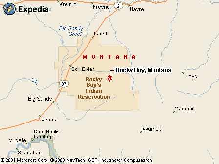 Located in north-central Montana, the Rocky Boy's Reservation consists of 120,000 acres which range from rolling high-plains grasslands to the sub-alpine environment of the Bear Paw Mountains. The reservation lies 50 miles south of the Canadian border near the boundary separating the provinces of Alberta and Saskatchewan. The nearest town is Havre, 26 miles to the north. The nearest urban center is Greatfalls, which has a population of 57,000 and is located 100 miles to the southwest of the reservation.