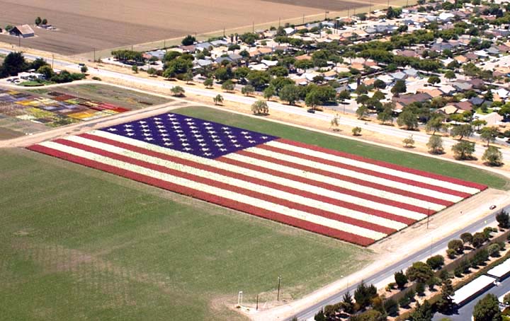 The above photo was taken courtesy of Bill Morson in Lompoc, CA. The 2002 Floral Flag is 740 feet long and 390 feet wide This Flag is 6.65 acres and is the first Floral Flag to be planted with 5 pointed stars comprised of White Larkspur. Each Star is 24 feet in diameter each stripe is 30 feet wide. This Flag is estimated to contain more than 400,000 Larkspur plants with 4-5 flower stems each for a total of more than 2 million flowers.
