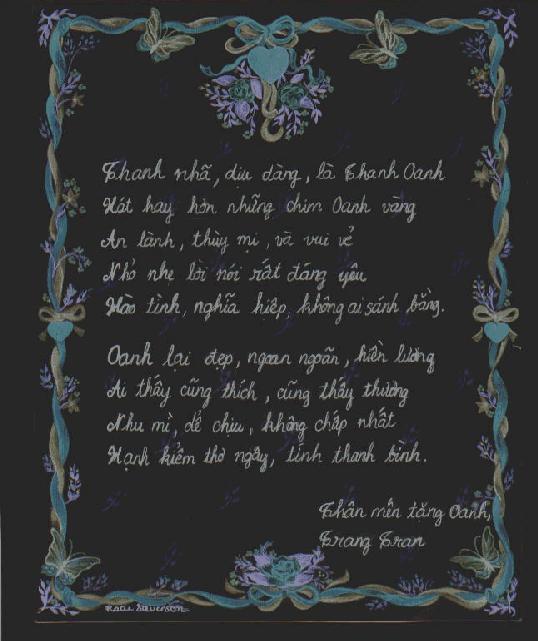 This's Oanh.(She looks even much cuter in person :) We've known each other since sixth grade, and have been best friends right from the start. She's not only my best friend, but THE best of the best. I wouldn't say "we've been through thicks and thins" 'cuz that'd be exaggerating, which is something that I'd NEVER do!!! (by the way, did I tell you I came across this creature that's as tinyy as an aunt, has 10 legs and 4 heads, and it talked to me in my own native language, which is the ZooLoonese language???) hehe... Anyways, we've had our lefts and rights together. uh.. I meant.. our ups and downs. Can you believe that during that 7 years of being friends, we've only had one fight?? The fight was pretty big though 'cuz we went on like for 4-5 months without talkin to each other, and all because I say we split this dollar we found on the street 50/50, and she said "let's flip a coin". hehe..j/k again. The fight was over something so stupid that we didn't even remember. Anyhow, we made up in the end and haven't had any more fight since then. :) Having her as my best friend is one of the things that I'm most grateful for. I know I know.. I'm being real... um.. "ghetto"?? <--a word that Tina, Oanh's sis, uses on everyone. but I'm saying all this to show my gratitude toward our friendship. I mean.. I see how other ppl claim this person to be his/her best buddy, and the next month or so they'd be asking "who???" I'm thankful that it's not like that with us. hm.. anyways, below's a "poem" that I wrote in dedication to Oanh, and everything in there is based on her true wonderful characters and personality. Sooo.. hm.. GUYS!!! this is your chance to meet the girl of your dream here!!! It's an once in a lifetime opportunity ya know???? so what you waitin for??? Pick up that phone and dial 10-10-321 Collect now!!!! *uh.. oops, wrong commercial* hehe.. there's the email add. if you want to write to her.