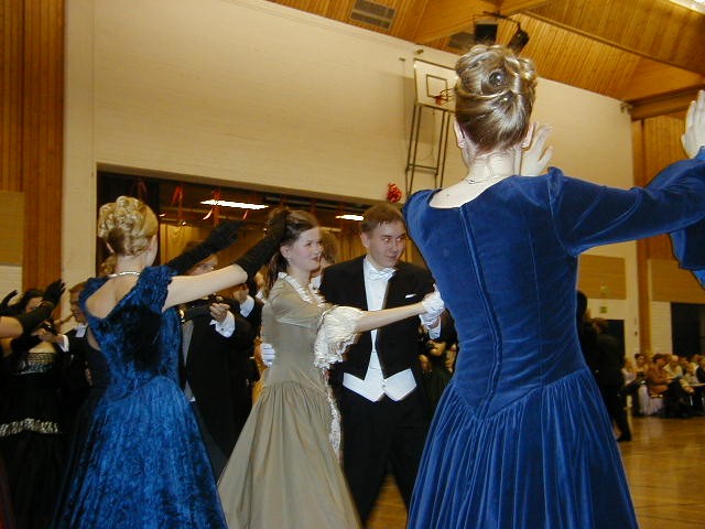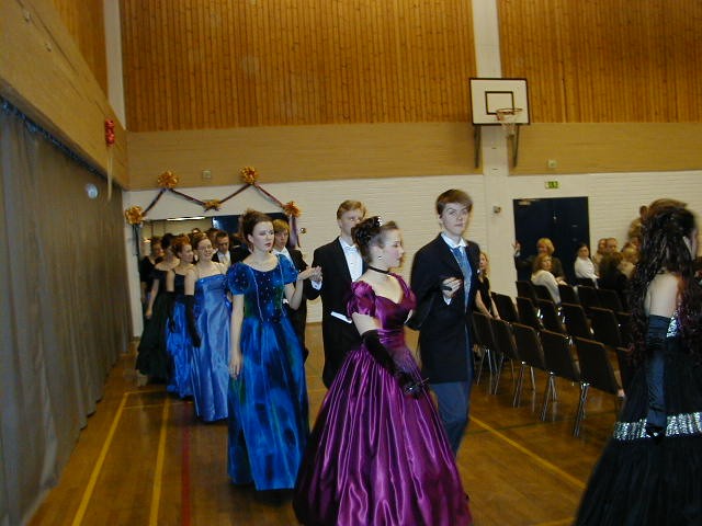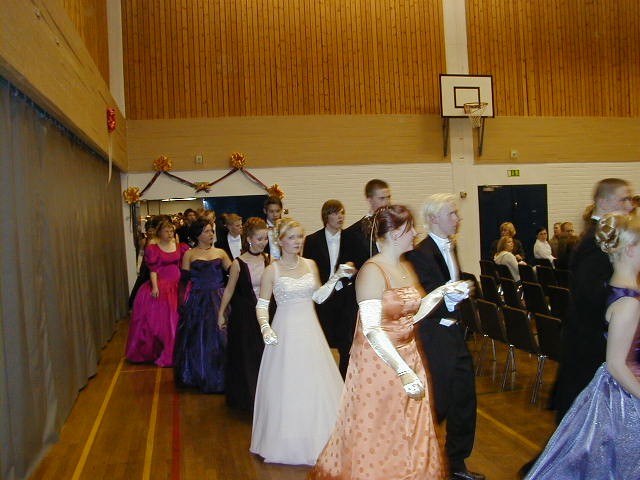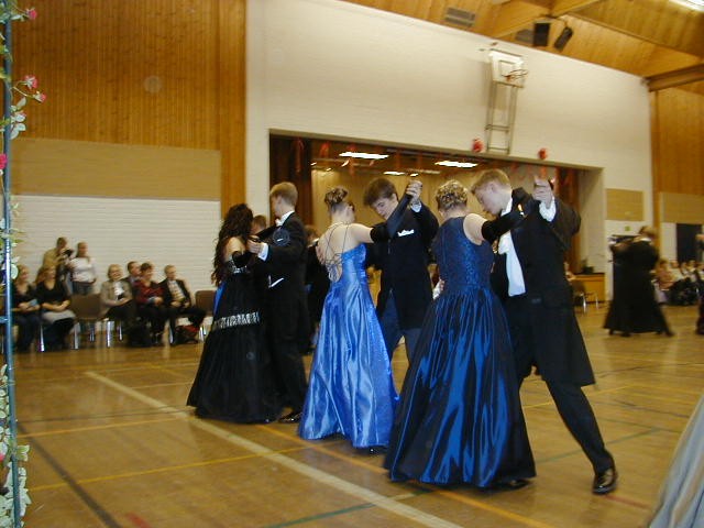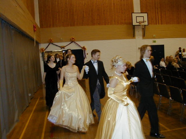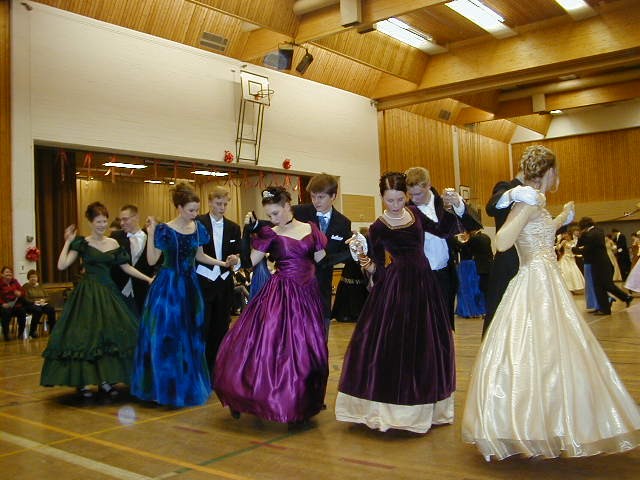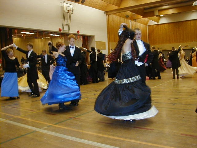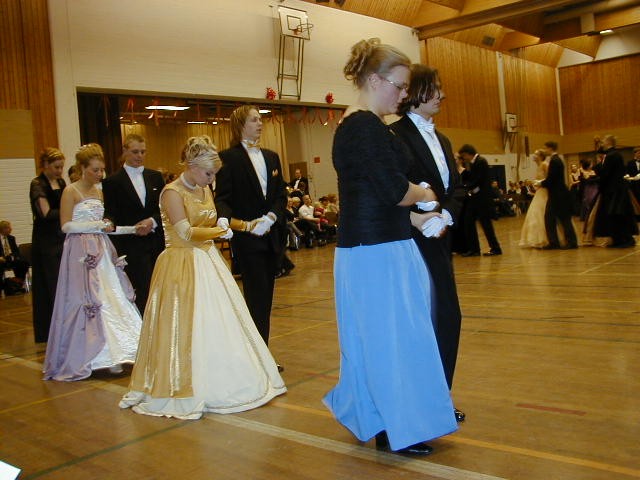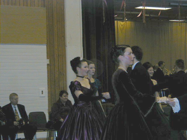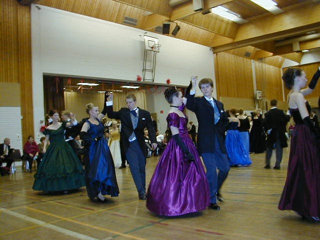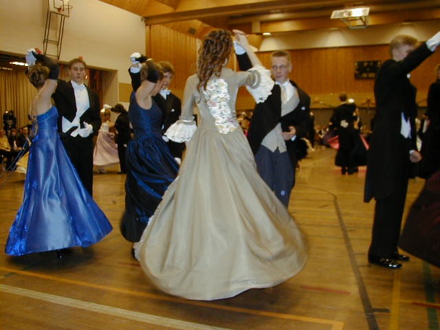 This is only 7 of 14. They are all tied together in some form. There was a small wind orchestra playing the songs. There was 2 shows per day. 40 couples in each dance and I was in both of them. Thursday in the evening for the parents and Friday morning for the students and teachers. Heres the kicker- Thursday is the party night. After our big event we all went to 'La tour' a real fancy french restaurant in downtown Helsinki. We had Duck and Lamb and all the rest. after this everyone headed to the club when half of us including me could not get in. ID or nothing. Oh well. The next morning is interesting because we have our first dance at 10 am. People have been out since 6 am so they are either still drunk or having a real bad hangover. This is when the dances become interesting. One guy didn't even make the first dance cause he spent the night in jail... ohhh those Finns. Ok. Enjoy.