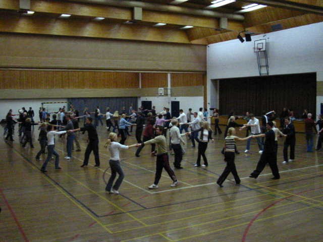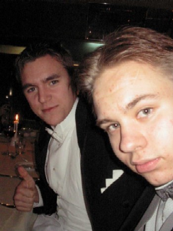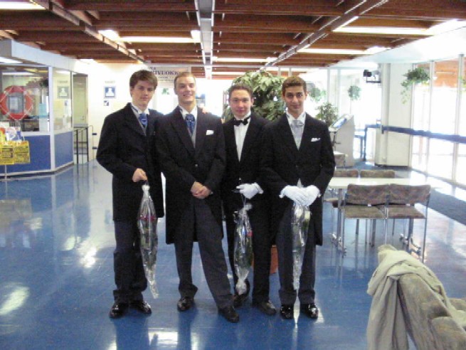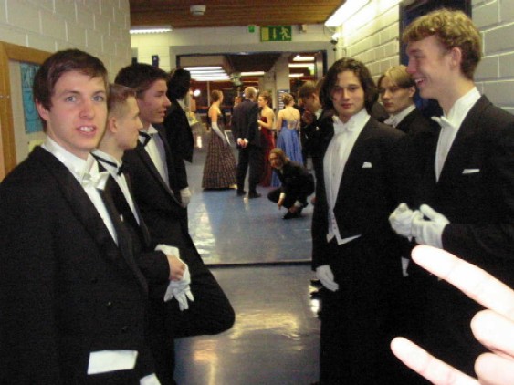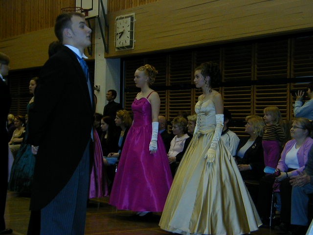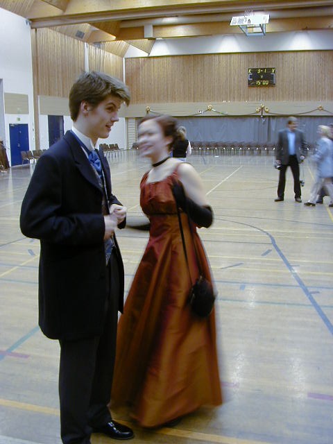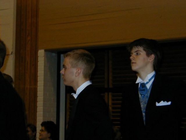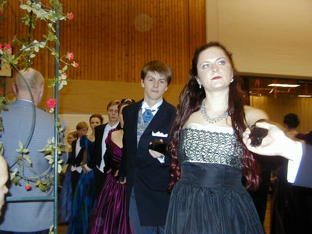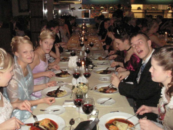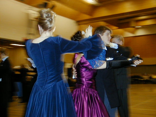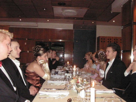 This is only 7 of 14. They are all tied together in some form. There was a small wind orchestra playing the songs. There was 2 shows per day. 40 couples in each dance and I was in both of them. Thursday in the evening for the parents and Friday morning for the students and teachers. Heres the kicker- Thursday is the party night. After our big event we all went to 'La tour' a real fancy french restaurant in downtown Helsinki. We had Duck and Lamb and all the rest. after this everyone headed to the club when half of us including me could not get in. ID or nothing. Oh well. The next morning is interesting because we have our first dance at 10 am. People have been out since 6 am so they are either still drunk or having a real bad hangover. This is when the dances become interesting. One guy didn't even make the first dance cause he spent the night in jail... ohhh those Finns. Ok. Enjoy.