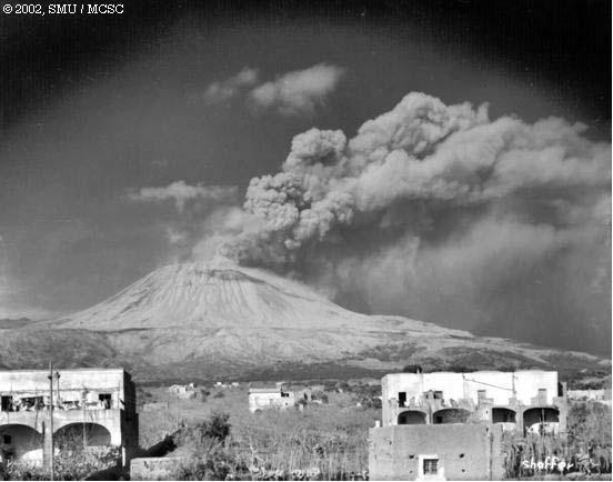 On March 13th, 1944, the conelet partially collapsed leaving a depression in the ground of about 60 feet depth. On the 18th, the first lava flows shot out of the conelet and overcame the crater wall on the North side and reached the Somma Caldera Wall. On the evening of the 19th, the lava flows reached the first houses in Massa and St. Sebastiano.