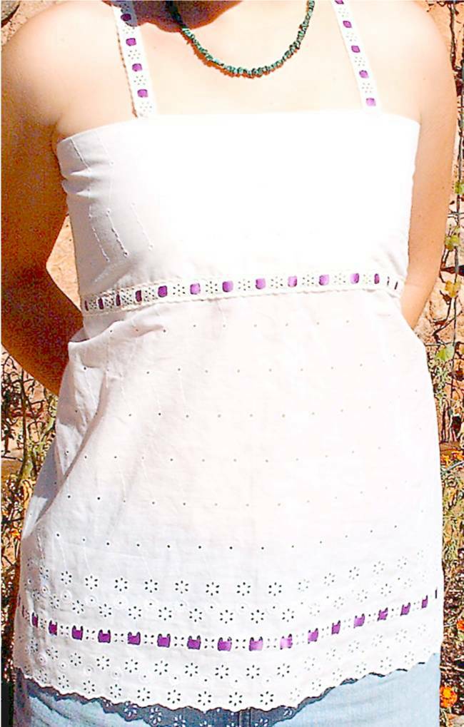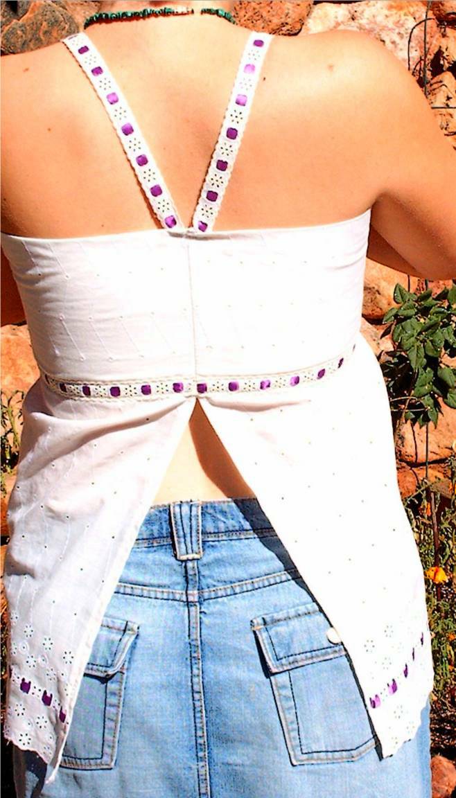 This top is is made out of a off white eyelet material. The bottom has a beautiful edging. Around the bodice part is a ribbon weaved through eyelet trim decortaing the bottom of the bodice. The straps are made from the ribbon and eyelet trim. This top is open in the back. The bodice is lined and all seams are neatly sergered.
