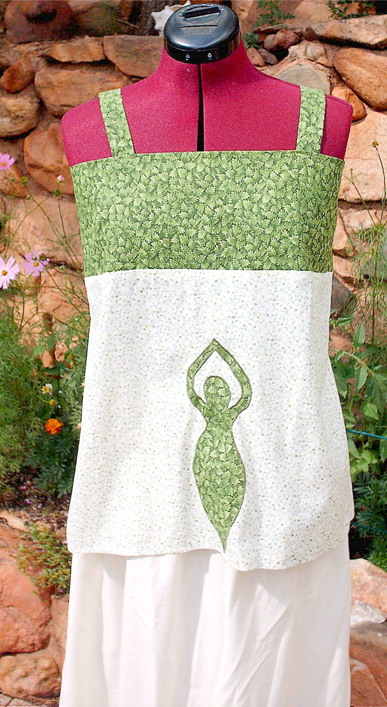 This top is an apron style top. It is made out of a green leave print and a white and green calico print with a green goddess aplique. The bodice of this top is lined with the green leave fabric. The back is opened with sraps that tie. all seams are neatly sergered.