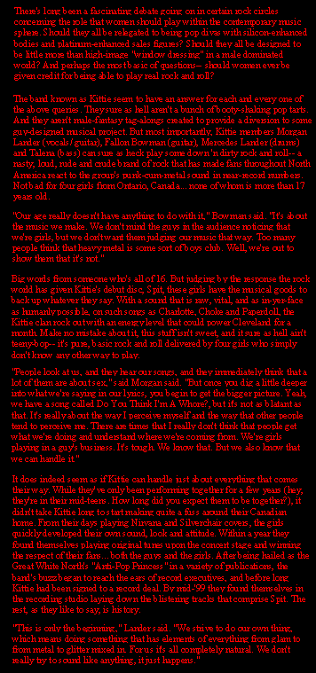 Ok, basically i'm really sick and tired of reading magazine articles about KITTIE. As a fan, i know the enormous amount of talent KITTIE has, and it pisses me off to read an article about them and all i hear about is how sexy they are and how they are hardcore chicks and about how young they are... every article i read says the same shit! and NOTHING about the music... For example... Read This HIT PARADER Article...