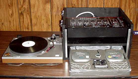 This system includes the MTX 4 Channel Mixer, 2 Awia Portable CD Players, 1 Sharp Portable Minidisc Player, & A Turntable |
