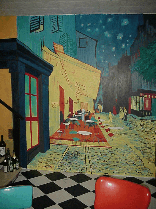 chairs in the mural the same colour and shape. Somehow, I couldn't talk Mike into re-tiling the
