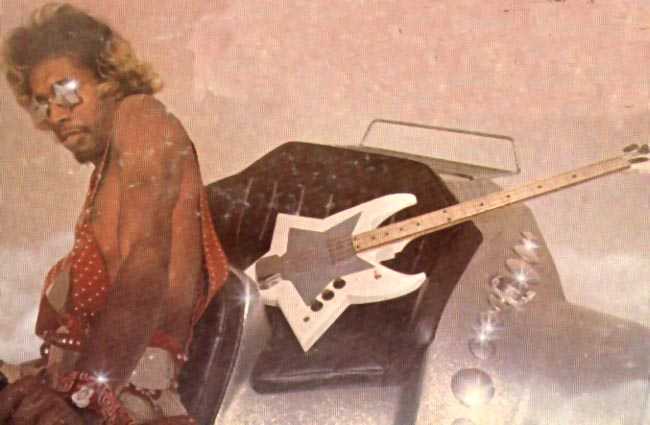 So here's the story of the origin of Bootsy Collins' custom-made star-shaped space bass in the words of Larry Pless, the bass's creator/builder. (Thanks to Ron McGinnis for contacting Larry to tell his story.)