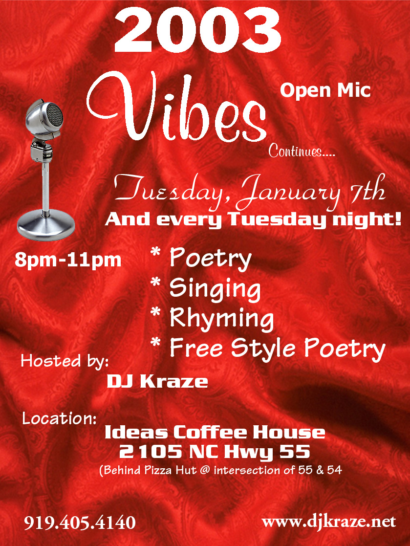 "Vibe" with DJ Kraze every Tuesday Night @ Ideas! Coffee House "Open Mic" @ 8pm!!!