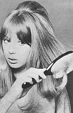 When my hair is dry, I remove the rollers. Then I lift the hair at the top of my head and back-comb or brush it until there is enough teased up to give me a little "crown". next, I comb over the teasing gently until the crown looks smooth and neat. Now I comb my bangs down over my eyebrows and, holding them lightly, flicks the ends up so that I get a curved line (which is very flattering to the eyes).