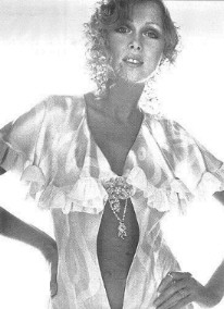 honeysuckle with coffee lace Deep honeysuckle Dacron satin nightdress, long and lean and liberally sewn with milky coffee lace. £12, by Janet Reger, who also make a long and lovely negligee to match, both from Debenham & Freebody's Total Look Department. Oval cameo brooch from a range at Hope & Eleanor, Chelsea Antique Market. Hair, by Roger at Vidal Sassoon. |