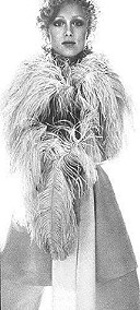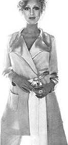 ![]() | White shined satin nightdress, washed with sea blue and lilac colour, languid and ankle length, with diamonds of bare skin and fluted cape and hem frilled with chiffon. 50 gns to order, from Annacat. Seed pearls twined and catching the cape, from The Golden Past. Shimmer blue and pink enamel bangles, from The Purple Shop; loads of pearl and sea turquoise rings, from Hope & Eleanor, Chelsea Antique Market. Hair curled by Roger at Vidal Sassoon. |