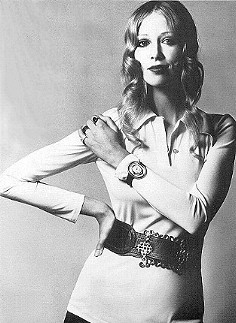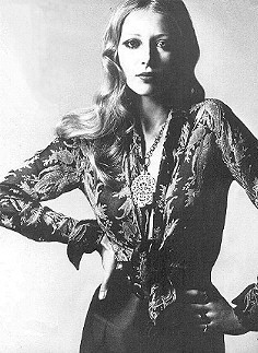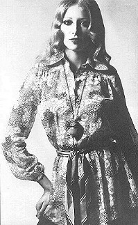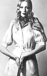 ![]() | CREAM SILKS, THE DRESS-SHIRT AND CLASSIC SHIRT Cream silk shirt, a classic, now a little longer at collar and cuffs. 6 1/2 gns, from Marrian McDonnell. Tawny and amber Indian print silk scarf, 30s, from Feathers. Scalloped blue scarf ring, £6, from Hope & Eleanor. Beige satin pants, by Ossie Clark, 6 gns, from Quorum. White watch and strap, by Obrey, 31 gns, from Browne. Hair by Ivanna at Vidal Sassoon. |