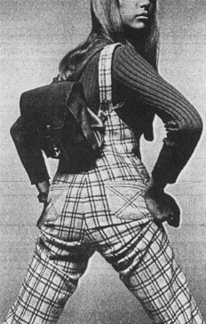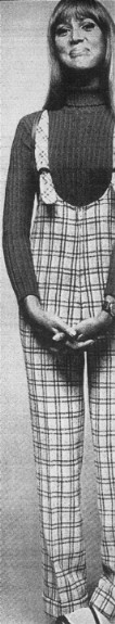 (3&4)Dungarees are back in the running this autumn. Here, made in beige and red checked wool, with gilt buckles; 6 1/2 gns. Red polo neck sweater, 39s. 6d. Both by Quant Ginger Group, at Miss Selfridge, Duke St., from September 1, Red leather satchel, 15 gns. Red and white boots in patent and canvas, 9 1/2 gns. Both from Medway. Red watch by Ingersoll. Red kid watchstrap, 25s., at Paris House.