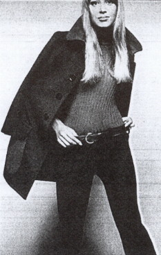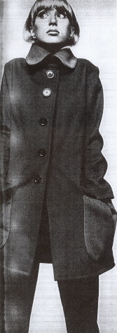 (5&6)Two colour trouser suit with two way jacket. In navy blue wool with emerald green collar and pockets, the jacket is long enough to double as an overcoat. Gerald McCann, 22 gns., at Woollands. Red swaeter by Quan Ginger Group.