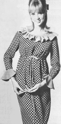 'With it' gear is here! A cool mod check cut-out with draw string bodice for the latest highline look - in easy care brushed afghalaine (that's fully washable and crease shedding too). It has plain matching frill collar an cuffs, in the latest style and comes in a choice of five real rave colours, Candy Pink, Red, Royal, Emerald Green and Kingfisher Blue. It's so easy to sew you can run it up in an evening.