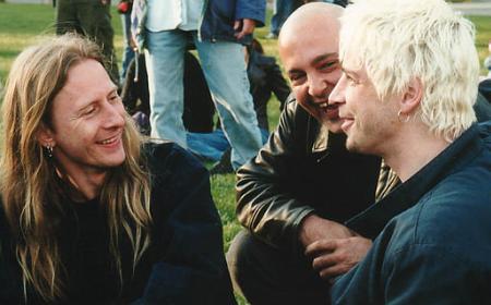 Jerry Cantrell, left, lead guitarist for the group Alice in Chains and Chris Cornell, right, from the group Sound Garden, share a private moment during an informal memorial for Alice in Chains lead singer Layne Staley Saturday, April 20, 2002 at the Seattle Center in Seattle. Staley was found dead in his Seattle apartment Friday, April 19, 2002. He was 34. (AP Photo/Anna Mia Davidson) |