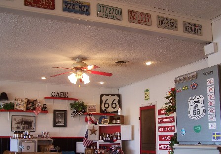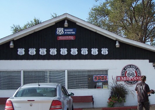 Not much of the old road remains except for a few sections around Vega, Adrian and Glenrio. Vega is clean but appears depressed. Adrian seems to be bouncing back, though, and one reason is the MidPoint Café. This wonderful place is at the purported middle ground between Chicago and Los Angeles. I suppose it depends on how you calculate such things (we put the western terminus at Santa Monica Pier, so the midpoint as we reckon it is probably somewhere closer to San Jon) but why quibble? Especially if you can get Ugly Crust Pies or personalized service from the owner! She told us we were fortunate to have arrived on that particular day as she would be out of town on a dental appointment the next day. And so we were. Coffee was excellent in a non-Starbucks kind of way, the food was down-home delicious and there was an amazingly comprehensive gift shop just off the dining room. This was our consolation for having missed the Oklahoma Route 66 Museum. We spent more than we should have and tipped handsomely, and walked out feeling like winners. Not like victims.