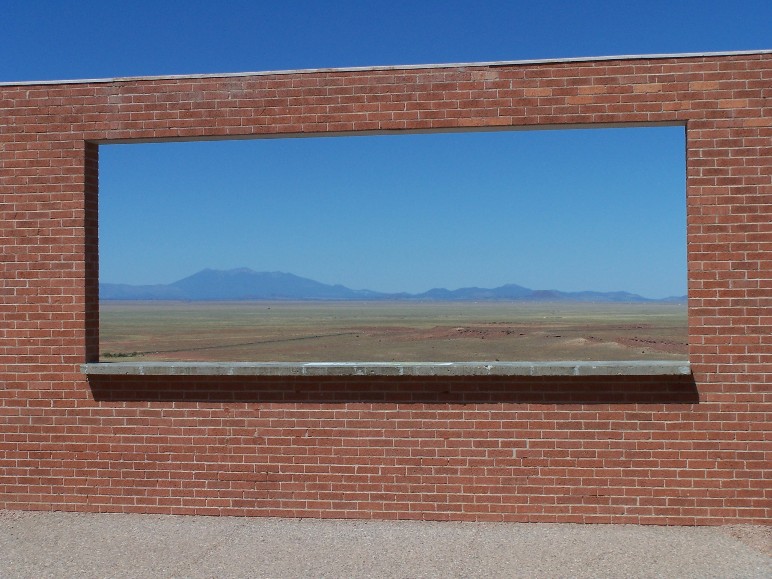 We climbed stairs, stairs and more stairs to get to the lower level of the center. The enclosure has a monument to space explorers, and one of the original Apollo boilerplate test mules is there with a mannequin seated in the center of the three-seat capsule. To the left is a wall commemorating those who have participated in the U.S. space program, and to our rear was a rectangular hole in the brick wall that at first looked like a painting of the desert. In fact it is a glassless picture window on the land northwest of the crater, looking toward Flagstaff and Humphreys Peak.