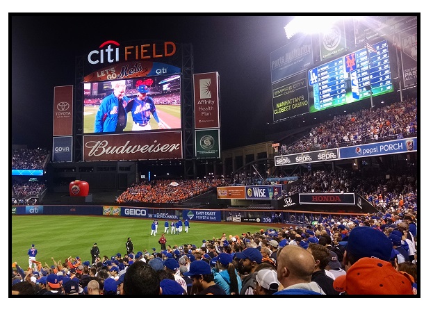 My first playoff game and it lived up to my expectations. The crowd was electric, there was not an empty seat in the ballpark. As I drove into the parking lot I noticed they did not have the Citi Perks parking that was there all season. Cost me $25 to park and I couldn't park in my usual space. While getting my stuff together I realized I had California license plates. OK, call me paranoid but I got two Mets hats out of my trunk and put one in the back window and the other on the front dashboard.