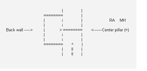 This diagram shows the dm2 lava U-bend curve. The > indicates the direction (either forward, strafe left, right or move backwards key) which must be held in correspondance to the direction the player is facing to gain air control, it must always be the key that would normally move the player toward that center pillar. If > is the forward key, the player must face the center pillar. If the 'strafe right' key is held (when coming from the direction indicated) then the same aircontrol is gained by facing forward, if the strafe right key is used obviously the player must be facing backwards, and if the walk back key is used the player will face the back wall as they curve around. Each combination gives exactly the same effect its all down the which direction the player is facing.