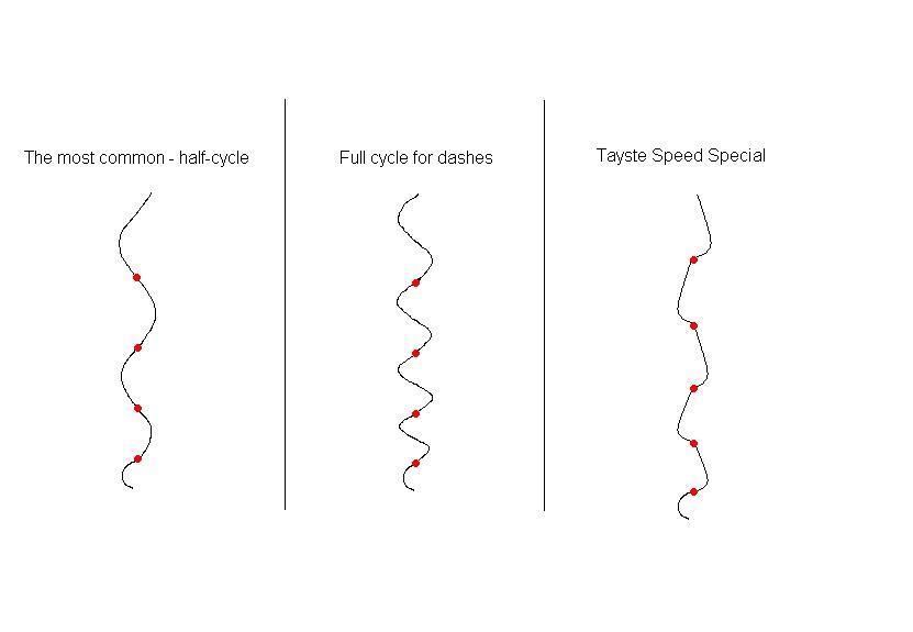 Once you have learned the timing you can now bunnyhop! You can start with an accel jump or whatever you like and then continue to hop along, using aircontrol techniques to turn corners. However if you still want to learn more and move faster still, you should use effective bunnyhop patterns with your aircontrol skills to speed yourself up along the way, you can develop your own patterns and create a distinctive style for yourself, or just use a traditional half cycle pattern which is very common. Anyway here are 3 examples of the main patterns i personally use and usually mix up a bit on the go. To go with these patterns i have done a demo with all 3 variations. The red dots in the patterns indicate when the player hops (although this is very rough and jumping can occur at different times, usually immediately after a change in direction). I know the patterns aren't very well drawn but this was the best i could come up with in paint! In the demo, after showing the 3 patterns i do a quick move using the pattern i often use.. the Tayste special (lol), which features short consistent erratic mouse movements.