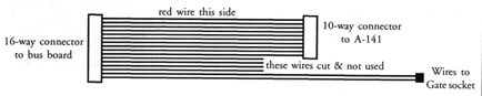 Finally, a new ribbon cable is required, this has to have a 10-way connector one end and a 16-way the other, but it has to have a 16-way cable with one of the spare wires longer, this is the gate connection and will be soldered directly to the Gate socket. To make up this cable you really need the special tool for assembling IDC cable, but it can be done by feeding the IDC cable into the socket and clamping it together in a vice. You must use a 16-way IDC cable, though you only need a piece 200mm long. Fit the 16-way connector to the cable, then measure off 125mm from this connector and cut through the first 10 wires (this must include the RED lined wire), peel off the unconnected edge - this part of the cable is not needed. This leaves 6 wires, seperate these from the main cable by a further 30mm, then seperate the end 2 (this is the Gate connection), the middle 4 wires are not needed and can be cut off where they come out of the attached ribbon cable. Then attach the 10-way IDC connector to the remaining 10 wires, note the orientation of the connector, when laid flat down, the connectors face opposite directions, check with the original cable that was removed for confirmation of the way it is connected