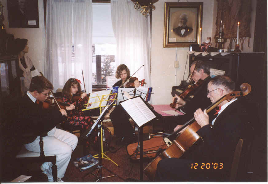 The string quintet performed Christmas and Chanukah selections during the open house at the Waushara County Historical Society Museum on December 20, 2003. Pictured Left to Right, clockwise are Steve Kasubaski, violin; Kendra Koback, violin; Tasha Buchholz, violin; Bruce Runnels, viola and Rev. George Waddell, cello.