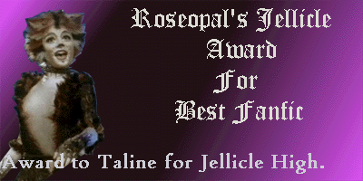 Jellicle High has won some awards. Ever so many thanks to the people who read my story and liked it. If you have any awards I can win for my story, please let me know. Or you can just send them to me without me asking:) It's fun finding new awards in my mailbox.