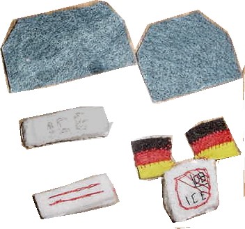 The backpack and flags are sewn to the back of the shirt as well as more embroidery which is then sewn to the pants.