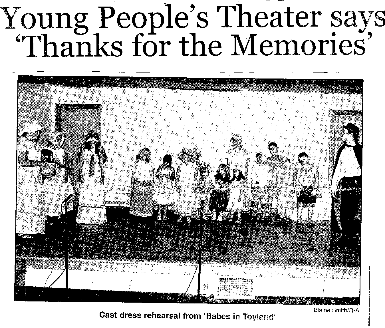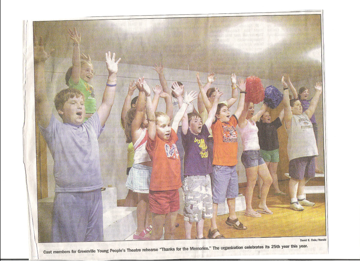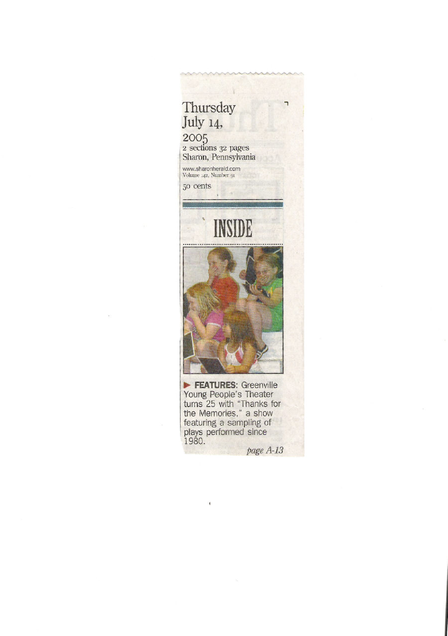 Young Thespians putting on a show By Monica Pryts Herald Staff Writer In 1979 Charlotte D'Alfonso volunteered to help the man who was directing a play and workshop at the Rec Center. I just went from there said Mrs D'Alfonso, who is celebrating her 25th year as director and founder of Greenville Young People's Theatre. Next week, the youth will present "Thanks For The Memories," a stage show featuring a sampling of plays the thespians have performed since 1980. About 30 people ages 3 to 28 are participating in the production, which is funded in part by Greenville Area Leisure Services Association. The youngest children play various animals, while older members sing, dance and narrate. The actors have been rehearsing since the beginning of June in Fisher Hall of Zion's Reformed Church of Christ, Greenville. They rehearsed in Greenville Recreation Center until 1989, when building renovations brought bad acoustics. Until last year, they rehearsed at East Elementary School, but they're no longer allowed us to use the gym. Mrs D'Alfonso said she's grateful Zion's opened it's doors to the group this summer. The hall has been transformed into a small theatre complete with a makeshift backstage area, colorful costumes and scenery and rows of seats. Most of the groups members are from Mercer, Sheakleyville and Greenville and have returned year after year. Many of the children are following in the footsteps of thier parents who belonged to the group when they were younger. This years play features three children from the Anderson family of Mercer. Zoe, 13, Orion, 9, and Kieran, 4. "We came back because our parents were in the group and we don't get a chance to do this in Mercer," said Zoe, who's been a member for seven years. Orion is in his sixth year and enjoys being in plays because he makes new friends and learns new skills. "You get to learn stage directions and theatrical arts," said Orion. Since joining the group 12 years ago, Ken Arnold, 22 of Fredonia has decided to take theatre to another level. He graduated this year from Edinboro University with a history degree and plans to attend graduate school next year to study theatre history. "I have a geat love of the theatre, and this year we have a sharp, intelligent group of kids," Arnold said. Arnold is doing a little bit of everything for this year's play, including acting, assistant directing and stage managing. He said he's glad to share skills he's learned fro Mrs D'Alfonso. Anthony D'Alfonso, 11, Mrs D'Alfonso's grandson, said he returned for his sixth year because he likes building scenery and acting. His mom, aunts, uncles and cousins were members. "The group teaches the kids a lot about how to work well with other people and keeps them up o their reading and listening skills," said co director Jen Ferguson, 28. Ms Ferguson said she has many special memories of her 18 years with the group and hopes audience members at next week's play will share the good times they had with the Greenville Young People's Theatre.