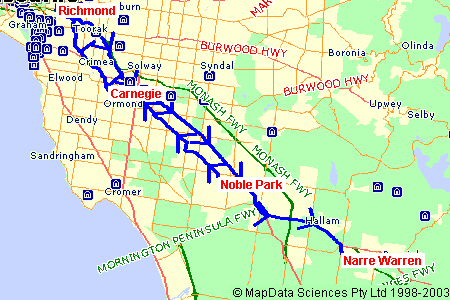 This second map is also of important places in Vanessa's life. Mapped here is Richmond, which is in Melbourne at Spencer street, Vanessa done her first performance with her guitar. Also in the picture is Carnegie where in a Russian restaurant, Vanessa was famously 'discovered' by Jack Strom.