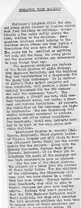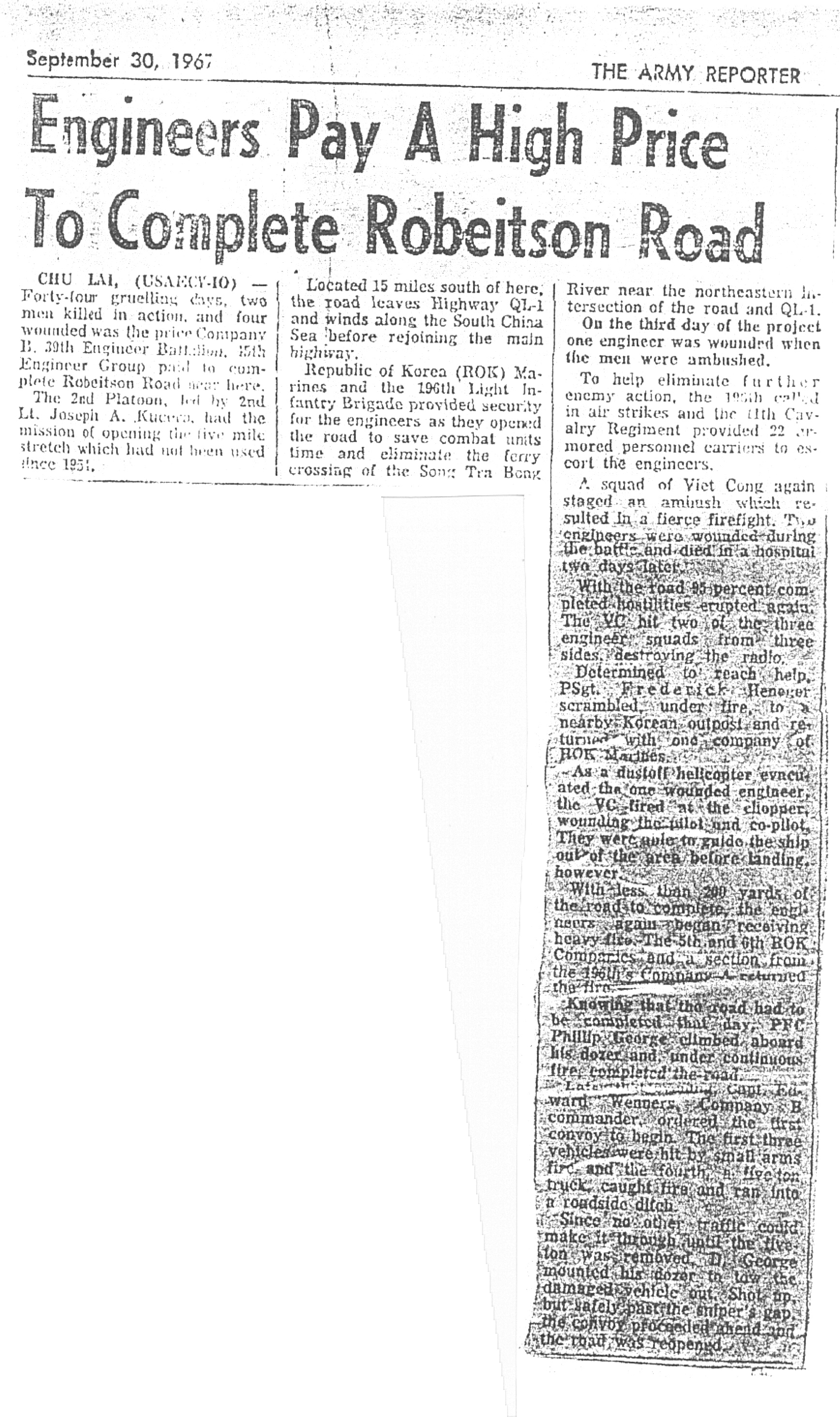 Click here for Article #02 SP4 JERRY VAN 39TH EN. HHC WORKED IN BN. MAINTANCE. HE HAD A DOG THAT WAS REMOVED BY PERSONAL FROM AMERICAL DIV. HE WROTE LETTER TO HIS SENATOR, GEORGE MURPHY, WHO WAS ON SENATE ARMED FORCES COMMITEE AT THE TIME.