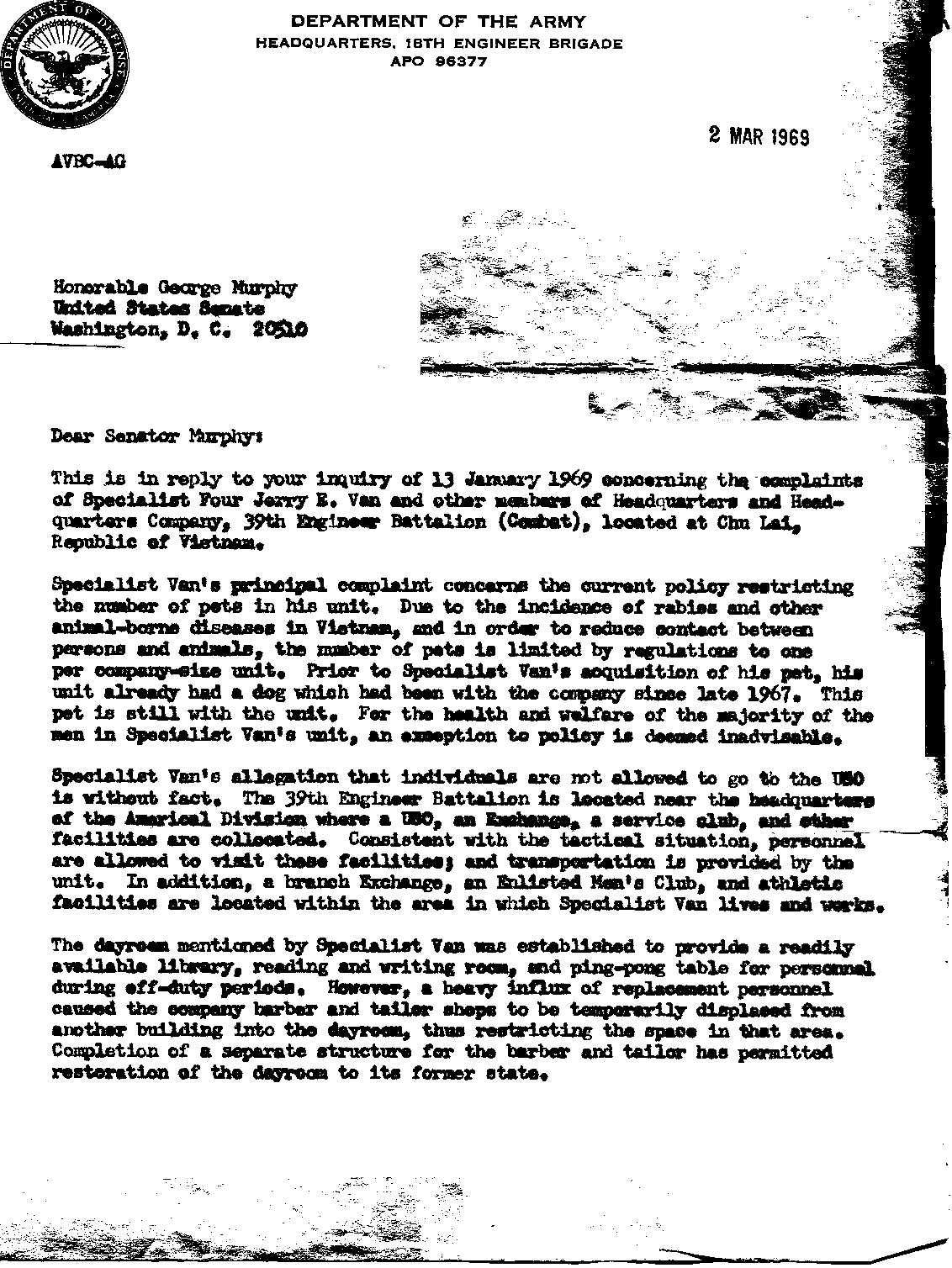 VAN WAS THE GUY WHO ALWAYS HELPED OUT SOMEONE WHO WAS HAVING PROBLEMS. ONE TIME HE TOOK GUARD DUTY FOR SOMEONE WHO HAD TO GO TO AMERICAL TO COMMUNCATE WITH HIS FAMILY IN THE STATES. THESE LETTERS WERE THE REPLY TO HIS LETTER TO SEN. MURPHY. HE SENT THEM TO ME AFTER I