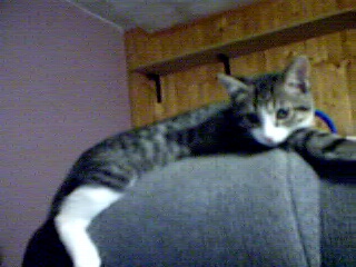 Here's "Say10!!" He'll run up the steps, come in my room, climb up the back of my computer chair, and lay there 'til I give him attention. He'll paw at my head or climb down my shoulder and start biting on my hands while I try to type. He craves attention, and knows I'll be the one to respond. No matter what the hour is.