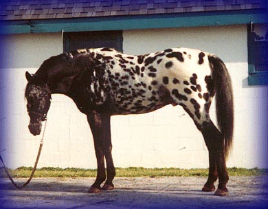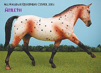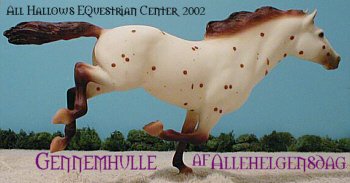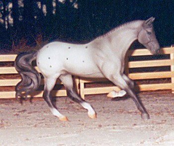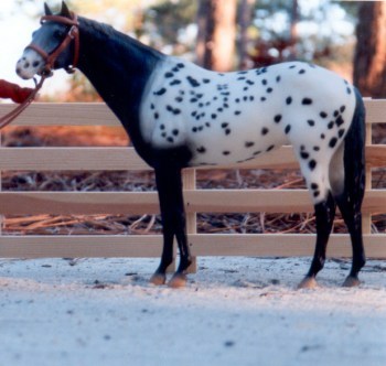 | Wap Spotted f. 1987 First foal crop estimated 1993. Black bay, blanket with spots,near leopard Appaloosa Sporthorse stallion. Sire: Wap’s Spot 2 (Acorns Thistle Britches x Wapiti’s Dido Silver) Dam: Shalako Summer (Shalako’s King x LP Summer Plaudit) Breeder: Kismet Farms. Sire is double-Wapiti bred, dam is double-Plaudit bred. Foundation sire of the Appaloosa Sporthorse Association, registered with the American Warmblood Registry, as well as the ApHC. Our honorary foundation sire, please be sure and visit him at the Kismet Farms website! MApSHA 0 0011141F 87/01 MApSHA 01F ![]() Siciliano Wap f. 1993 First foal crop in 1996. Black bay, extended blanket with spots, near leopard. OF Breyer "Wap Spotted." Sire: Wap Spotted [r] (Wap's Spot 2 x Shalako Summer) Dam: Treasured Morn (Zeus' Treasure x Ginger Morn) Breeder: Mythic Stone Stables. Sire is Wap Spotted, foundation sire of the Appaloosa Sporthorse Association (ApSHA); dam is by Stud Spider lineage and out of Thoroughbred stock. Has consistently placed top five in breed classes and color classes; has ribboned in trail, pleasure, croos country/endurance, and showmanship; qualified for TOPSA Championships 2002 in Cross Country/Endurance; second place senior sire at IPABRA Nationals 2001 (and the proof is in his get!); Model Appaloosa Sporthorse (MApSHA) Foundation Sire; MApSHA Silver Medallion Sire (with two Register of Merit get: Godfather 2 and Dubliner Wap); MApSHA ROM recipient, 2001; MApSHA Phoenix Crest (high point horse: 145 points) recipient, 2001; MApSHA Gold Medallion Sire 2002 (with 5 Register of Merit get); MApSHA LOM recipient, 2002; MApSHA Phoenix Crest (high point horse: 1,362 points) recipient 2002. Get include Godfather 2 (o.o. Friday Peacock; 1996 black leopard stallion; has consistently placed in the ribbons in breed and color classes; placed in Dressage at TOPSA and elsewhere; MApSHA ROM recipient, 2001; MApSHA ROM recipient 2002); Plaudit's Celtic Wap (o.o. Celtic Peacock [bso]; 1997 grulla, snowcap with spots; consistently placing in the ribbons in breed and color classes); Dubliner Wap (o.o. Treasured Shamrock; 1998 bay leopard gelding; has consistently placed in the ribbons in breed classes and color classes for geldings; has placed in Dressage at TOPSA, at least once in the ribbons, earning him a fifth placing in the 2001 TOPSA Dressage Championships; has ribboned in dressage in almost every other competition he has entered; a very versatile horse, he has also topped out in showjumping, and shows great promise as an eventer; MApSHA ROM recipient, 2001; 2001 HAHC Year-End Reserve Champion in Performance; MApSHA LOM recipient, 2002); Plaudit's Pixie Wap (o.o. Plaudit's Fawkesy Lady; 2001 chestnut semi-leopard filly; has consistently placed top three in breed, color, and gender classes for foals; MApSHA ROM recipient, 2002); Cairpre's Bardic Wap (o.o. Rian's Bardic Pride [RID]; 1996 chestnut semi-leopard stallion; has consistently placed top three in breed, color, and gender classes; MApSHA ROM recipient, 2002); Wap's Shalako Gadfly (o.o. Gadabout [KNN]; 1996 chestnut leopard mare; MApSHA ROM recipient, 2002). Consistently throws high-color (90% leopard or near-leopard) get wtih athleticism and versatility. Standing 1996-current. It is preferred that his foal’s names contain “Wap” in some form or fashion if possible. mythicstonestables@winning.com Mythic Stone Stud MApSHA 0 0011142F 93/01 MApSHA 02F ![]() ![]() ![]() ![]() ![]() ![]() ![]() Godfather 2 f.1996 First foal crop in 2000. Black leopard Appaloosa Sporthorse stallion. Breyer “Hank, the Ranch Horse” mold #750 OF. Sire: Siciliano Wap (Wap Spotted [r] x Treasured Morn) Dam: Friday Peacock (Plaudit Peacock x Girl Friday 2 [TB]) Breeder: Mythic Stone Stables. Sire is Foundation Sire of MApSHA, by Appaloosa Sporthorse Association foundation stallion, Wap Spotted, also registered with the American Warmblood Registry and the ApHC; Dam is of Prince Plaudit and Secretariat lineage. Up-and-coming halter and dressage horse, has placed high in breed and color classes; placed top ten in dressage at TOPSA. mythicstonestables@winning.com Mythic Stone Stud MApSHA 0 0007503F 96/01 MApSHA 03F ![]() ![]() ![]() Runningwolfappitude f.1984 FFC 1988 (Beltanes Wine X My Mighty Sequoia) RWA's Sire is a retired western performance champion, who also did well in english trail and open english pleasure. My Mighty Sequoia is still competing in English and Western Pleasure as well as halter. RWA was the HAHC 2001 Overall Performance Champion. He has also earned his 2001 ROM with MApSHA. Email for booking information. Sequoiashop@aol.com Running Wolf Model Horse Equestrian Center MApSHA 0 00PSBZ4F 84/02 MApSHA 04F ![]() ![]() ![]() Wap Peacock f.1992 First foal crop in 1995. Blue roan blanket with spots Appaloosa Sporthorse stallion. Breyer “Gem Twist” mold #726 OF. Sire: Wap Spotted [r] (Wap’s Spot 2 x Shalako Summer) Dam: Celtic Peacock [bso] (Prince Plaudit [r] x Rhiannon [bso]) Breeder: Mythic Stone Stables. Sire is Foundation sire of the Appaloosa Sporthorse Association, registered with the American Warmblood Registry, as well as the ApHC with Wapiti and Plaudit breeding; Dam is of Prince Plaudit lineage. Has placed repeatedly in the top three in English Trail classes. Qualified for TOPSA Championships 2002 in Other Sporthorse Stallion. It is preferred that foal’s names contain “Wap”. mythicstonestables@winning.com Mythic Stone Stud MApSHA 0 0007265F 92/01 MApSHA 05F ![]() ![]() ![]() Plaudit Peacock f.1988 First foal crop in 1990. Strawberry roan snowflake Appaloosa stallion. Breyer “Running Stallion” mold #928 OF. Sire: Prince Plaudit [r] (Red Plaudit x Princess Rita) Dam: Daze E. (Snoop E. x Dazed) Breeder: Mythic Stone Stables. Sire is ApHC Hall-of-Famer Prince Plaudit; dam is of the Snooper E. line. Has photo show placed in breed and color classes. Throws unusually high-color get. Get include Plaudit's Banshee (has placed top five in breed/colo