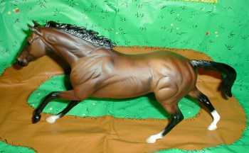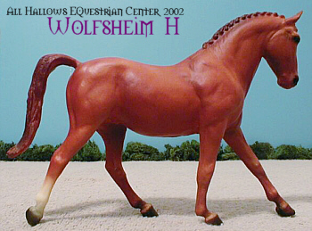 | CR Ulrich's Lucky Knight f. 1991 FFC 1995 Chocolate sorrel Shire stallion with white hocks and a blaze. Sire: Billabong Lucky Lad (Grayingham Lucky Lad [r] x Ladbrook Sheila [r]) Dam: CR Sorrel Queen of Cats (Sorrel King [r] x Wonda-Mere Puss [r]) Breeder: Clannad Rose Stables. Sire is real-horse-bred by imported Canadian Grand Champion Shire Grayingham Lucky Lad; dam is real-horse-bred homozygous sorrel. Has placed very well in halter and bloodstock classes and is qualified to compete in the IPABRA Benefit Series Championships 2002 and T Arrow Stables' Championship Show in December of 2002. Second Place Shire Overall at IMEHA World Circuit Championships 2002. Get include: Ulrich's Starlight Ghost (1996 blood bay gelding with four whites out of a real Shire mare; qualified for TOPSA Championships 2002); Ulrich's Prince of Cats (2001 chestnut colt out of a Shire mare with lines to Prospect Paladin [r] and Sorrel King [r]; has placed very well in halter classes; Gender Champion; qualified to compete in the IPABRA Benefit Series Championships 2002 and the ShadowRidge MHR Championships in December 2002; qualified for the TOPSA Championships 2002). Sporty lines; promises athletic foals with willing temperaments and determination. Standing 1995-current. clannadrosestables@dublin.com Clannad Rose Stud MApSHA 0 SR92IS01 91/02 MApSHA IS01 ![]() ![]() Wolfsheim H (World Cup I(r) X St.Pr.St.Anka (r) by Absatz(r)) 1985 bright chestnut Hanoverian stallion. Wolfsheim is full brother to the outstanding dressage sire Weltmeyer(r), Hanoverian Stallion of the Year in 1998. He traces to Sender through his sire, World Cup I (another Stallion of the Year), & to Abglanz (TK) through Absatz, his maternal grandsire. He has many talented Hanoverian & crossbred foals on the ground, including successful photo showers ApSH stallion Burning Wishes & ApSH IS Hanoverian Wolfshaunt H. He is currently available to sire foals only for MApSHA members, starting in 1989. I would like his foals' names to either contain the word "wolf" or begin with the letter "W", though that's not a requirement with crossbred foals. FairySteeds@yahoo.com MApSHA 0 3035IS02 85/02 IS02 ![]() ![]() ![]() Wolfshaunt H (Wolfsheim H X Azriel by Alme Z(r)) 1991 bay Hanoverian stallion. Sire: Wolfsheim H is full brother to the outstanding dressage sire Weltmeyer(r), Hanoverian Stallion of the Year in 1998. He traces to Sender through his sire, World Cup I (another Stallion of the Year), & to Abglanz (TK) through Absatz, his paternal grandsire. DamAzriel is a very refined example of a Hanoverian, primarily due to her Selles Francais sire. She carries real proven Zangersheide jumping bloodlines, including Ibrahim (SF), Umidwar xx (through Ultimate xx), Goldfisch II (Han) & Duellant (Han X2). Wolfshaunt himself is a successful halter photo shower, & has already passed on his excellent conformation & elastic gaits to Widdershins, a gorgeous Knabstrupper stallion. He is currently available to sire foals only for MApSHA members, starting in 1995. I would like his foals' names to either contain the word "wolf" or begin with the letter "W", though that's not a requirement with crossbred foals. FairySteeds@yahoo.com MApSHA 0 CKSRIS03 91/02 MApSHA IS03 ![]() ![]() ![]() O'Shagal (O'Gazal X Shagala by Shagal (Shagya III)(r)) 1989 chestnut Shagya Arabian stallion. Impeccably bred, O'Shagal is grandson to both O'Bajar & Shagal, with two crosses to Gazal VII & lines to Siglavy, Shagya, O'Bajan, Kemir, Koheilan, & rare Dahoman & Jussuf. Sure to add refinement, endurance, & athleticism to any sporthorse breeding program, O'Shagal is currently only available to sire foals for MApSHA members, beginning in 1993. FairySteeds@yahoo.com MApSHA 0 SMSRIS04 89/02 MApSHA IS03 ![]() ![]() ImpressMe f.1996 FFC 2000 Brown Dutch Warmblood stallion with four socks, star, strip and snip. Breyer #465 Roemer Sire: SIRE: Letmego-1993 bay Fleming Dam: Impressive Being-1990 bay id Boleem Breeder: Lu Shan Stables of New Jersey. As of yet, he's unshown and has not gotten any foals on the ground. martat@eritter.net ShadowRidge Breyer Stud MApSHA 0 0465IS05 96/02 MApSHA IS05 ![]() ![]() Mollys Pot Shot (Shot Gun Scott X MOPOT)1992 Bay Thoroughbred Stallion FFC 1995 {Cigar OF Breyer} Breeder: RWMHEC Shot is a model of my real TB Stallion of the same name. He was raced until 7 winning 13 races and earning over $100,000. Both he and his model are now entering a career in eventing. Mollys Pot Shot has successfully photo shown this past year, winning TB halter at the Jazzy Pride Farm Photo show. There are no restrictions to his breeding. Sequoiashop@aol.com Running Wolf Model Horse Equestrian Center Stud MApSHA 0 0476IS06 92/02 MApSHA IS06 ![]() ![]() NF Black Magic f.1998 FFC 2000 black w/ sock on left hind. Stallion. Breyer 1998 Retired Percheron Cross. Sire: Pleasant View King(r) (M.G.'s Prince(r) x Northwood's Starlight Nicole(r)) Dam: WitchCraft(bso) (Is he Real x Bewitched) Breeder: Nikita Farm. Sire is real-horse-bred, and is the Current World Champion Percheron! Dam is currently unshown, and is bso. Heavily shown, December HAHC halter champion. NF Black Auster, a 2001 colt was born and inherited the black. Does very well currently. No restrictions, although I do ask that each foal he sires has some form of "Magic" in, as his pedigree shows some sort of "witchery" in every generation. Either that or something about "Black". Thank you! PierreBear13@aol.com Nikita Farm MApSHA 0 0740IS11 94/02 MApSHA IS11 ![]() |