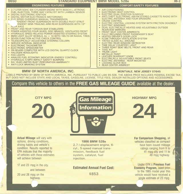 1986 BMW 528e Window Sticker