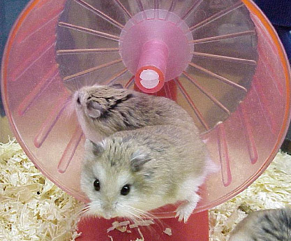 Roborovskis like to run in wheels a lot and if you have more than one robo in a tank, usually more than one will want to get on at the same time. This can be quite comical but you might also want to get more than one wheel in this case. Without their wheel, they might become quite restless and start to run the length of their enclosures and jump up and down along the sides. Video Clips |