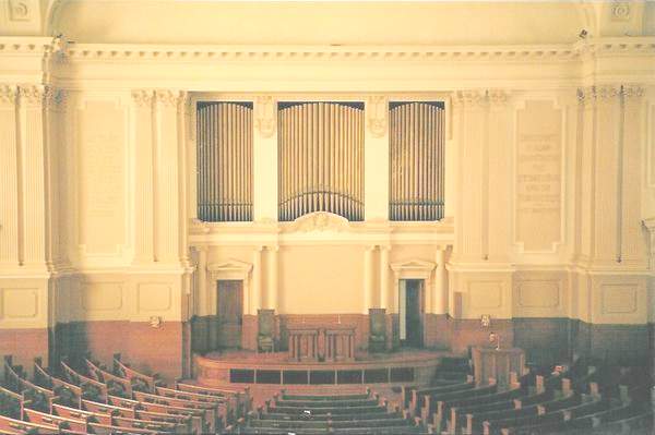 This instrument is chambered at the front of the room behind a large facade of gold pipes - some of which were speaking before the rebuild.