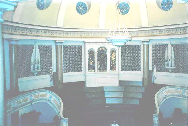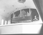 This instrument is installed in the rear gallery and is divided on either side of the rear window in matching cases. The added, exposed, Great division was cantilevered off the gallery rail directly behind the console.