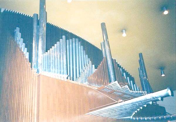 This instrument is installed in the rear gallery. It is largely chambered except for the polished tin and flamed copper pipes of the 8' Principal.