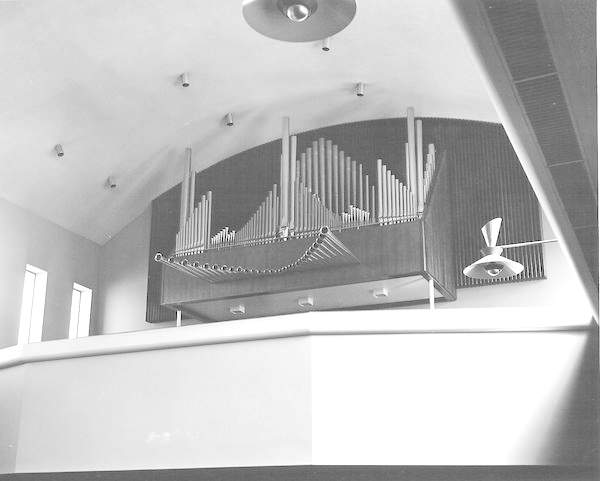 The organ occupies most of the projecting, rear balcony. It's handsome, Holtkamp-style display of unenclosed pipes is visually striking in the room. The Great has a unique and commanding 8' Trompeta Real which is the only solid brass trumpet stop in the State of Washington. This is the congregation's second pipe organ.