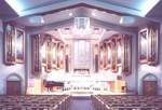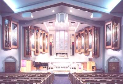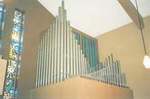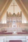 This instrument is installed at the front, right side of the modern sanctuary. The Great and Pedal are exposed in a pleasing, asymmetrical display with the expressive Swell enclosed behind them.