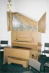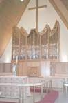This handsome new organ is located against the front wall of the A-frame church. It is free-standing and encased in quarter-sawn white oak with an attached, projecting keydesk.