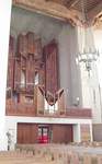 This instrument is free-standing in the rear gallery with an asymmetrical display of pipes. The Swell chamber sits to the left side of the exposed Great and Pedal organs. Stop nomenclatures are in Dutch.