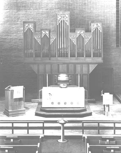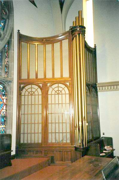 This was the congregation's first pipe organ. It was recessed into the side wall of the chancel. It had a quarter-sawn oak case with 21 gold-painted facade pipes which likely included the first 17 of the Great 8' Open Diapason. The keydesk was attached and projecting.